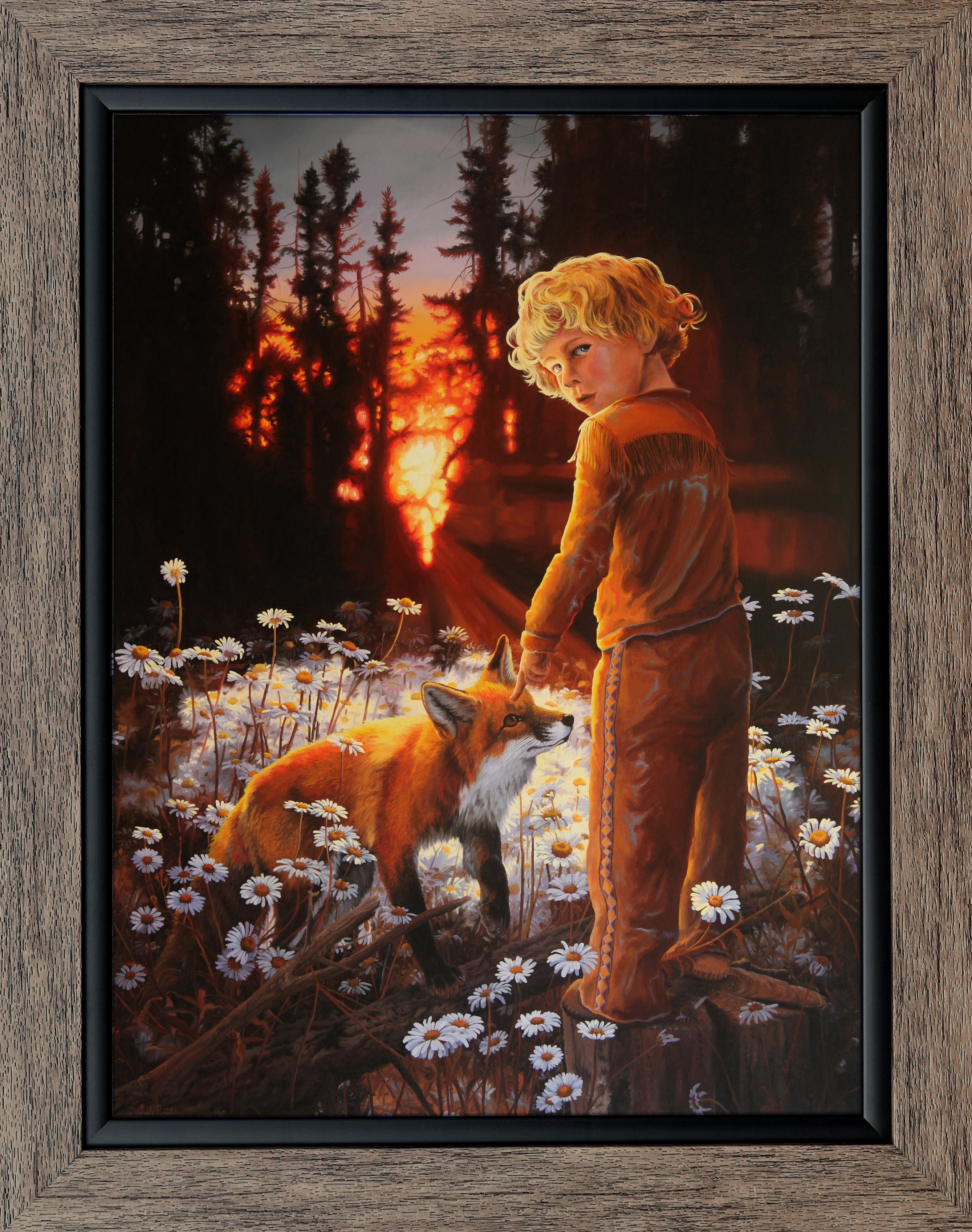 What if the Little Prince by Saint-Exupéry came back to Earth in the Canadian boreal forest instead of the Saharan desert? In this unusual and moving artwork, the dark tones and the raking light add depth to our encounter with the child from elsewhere. Anyone who observes the painting feels directly addressed by the main character, who we guess carries an important message. The fine art giclée on canvas is offered with or without frame. Discover some secrets of the original painting in the History section.